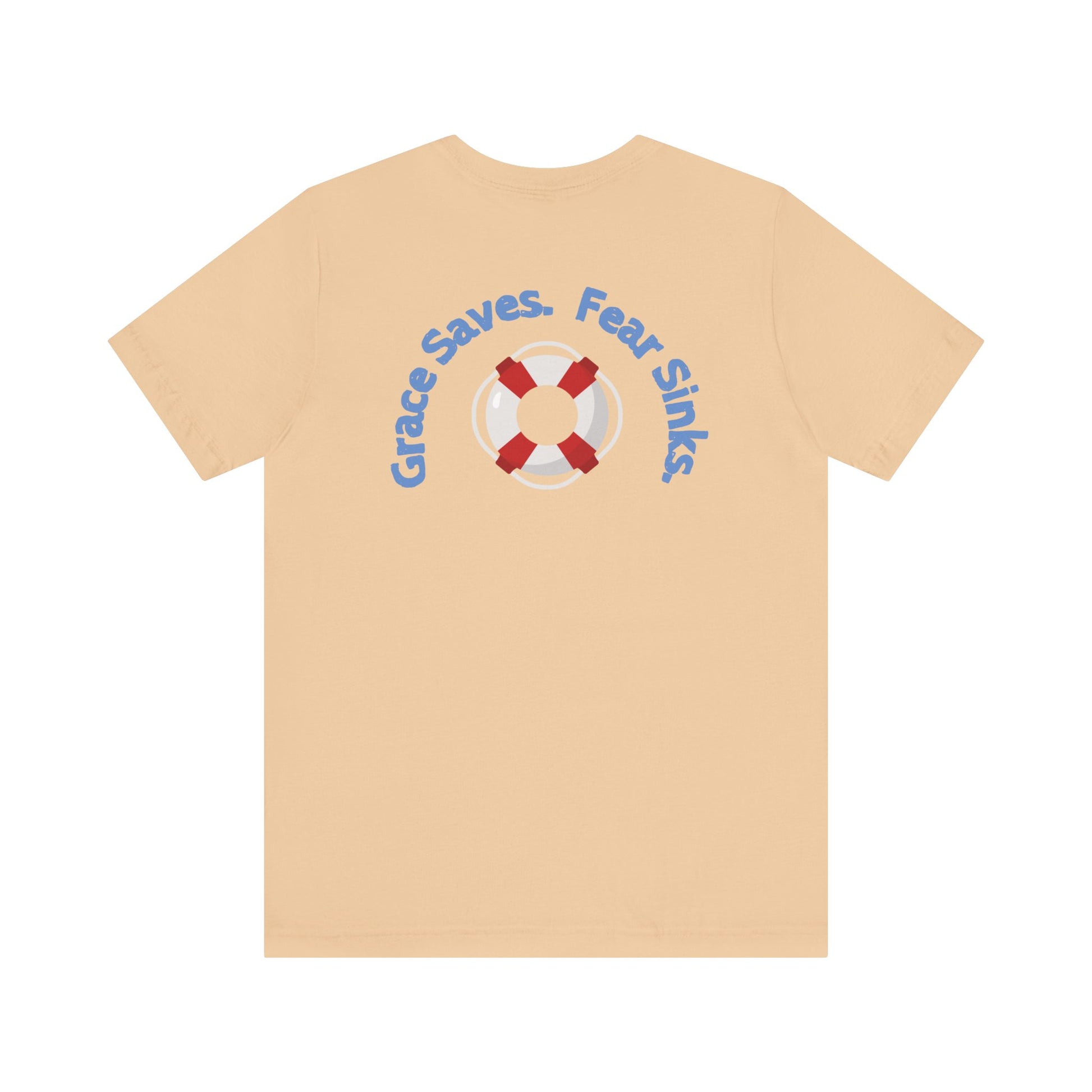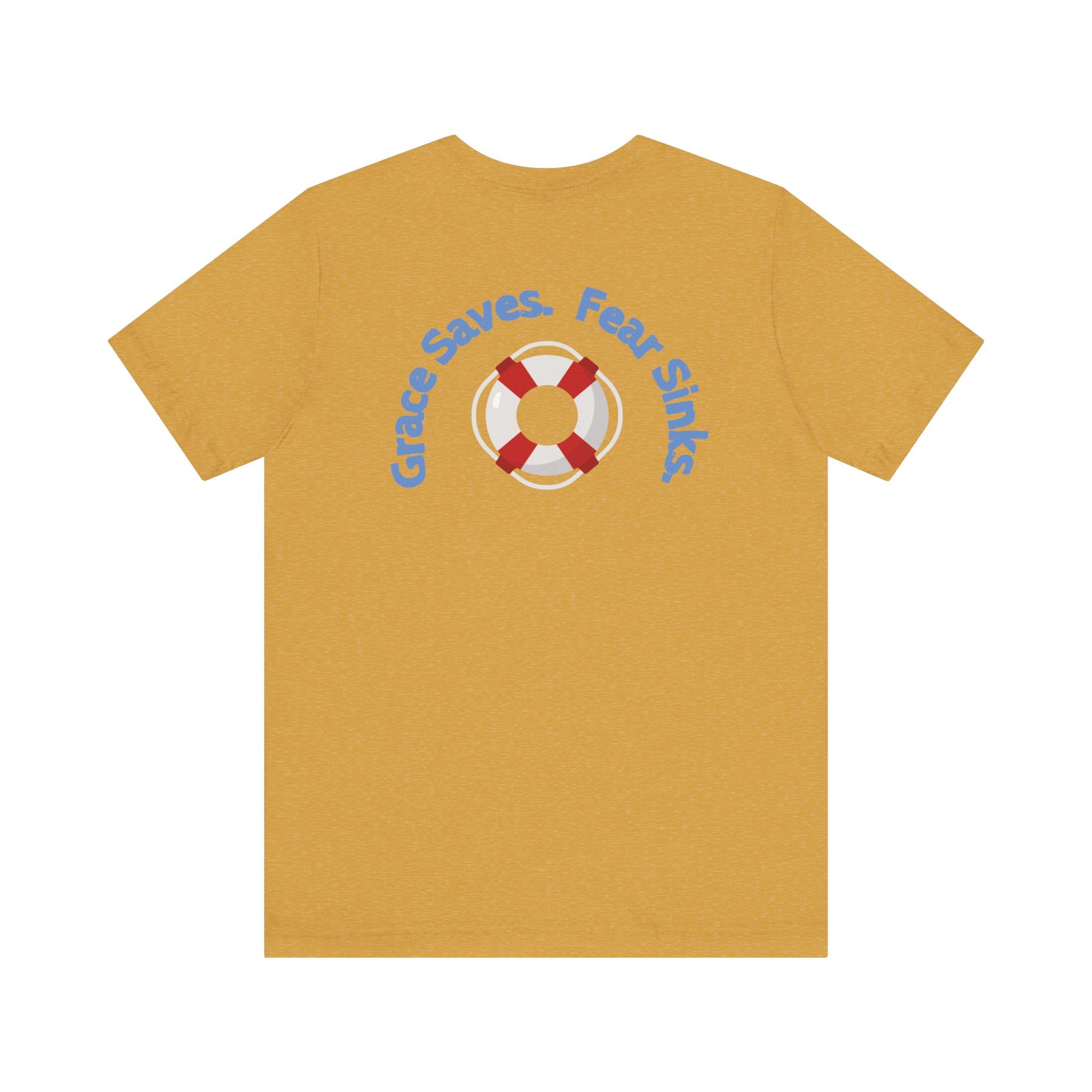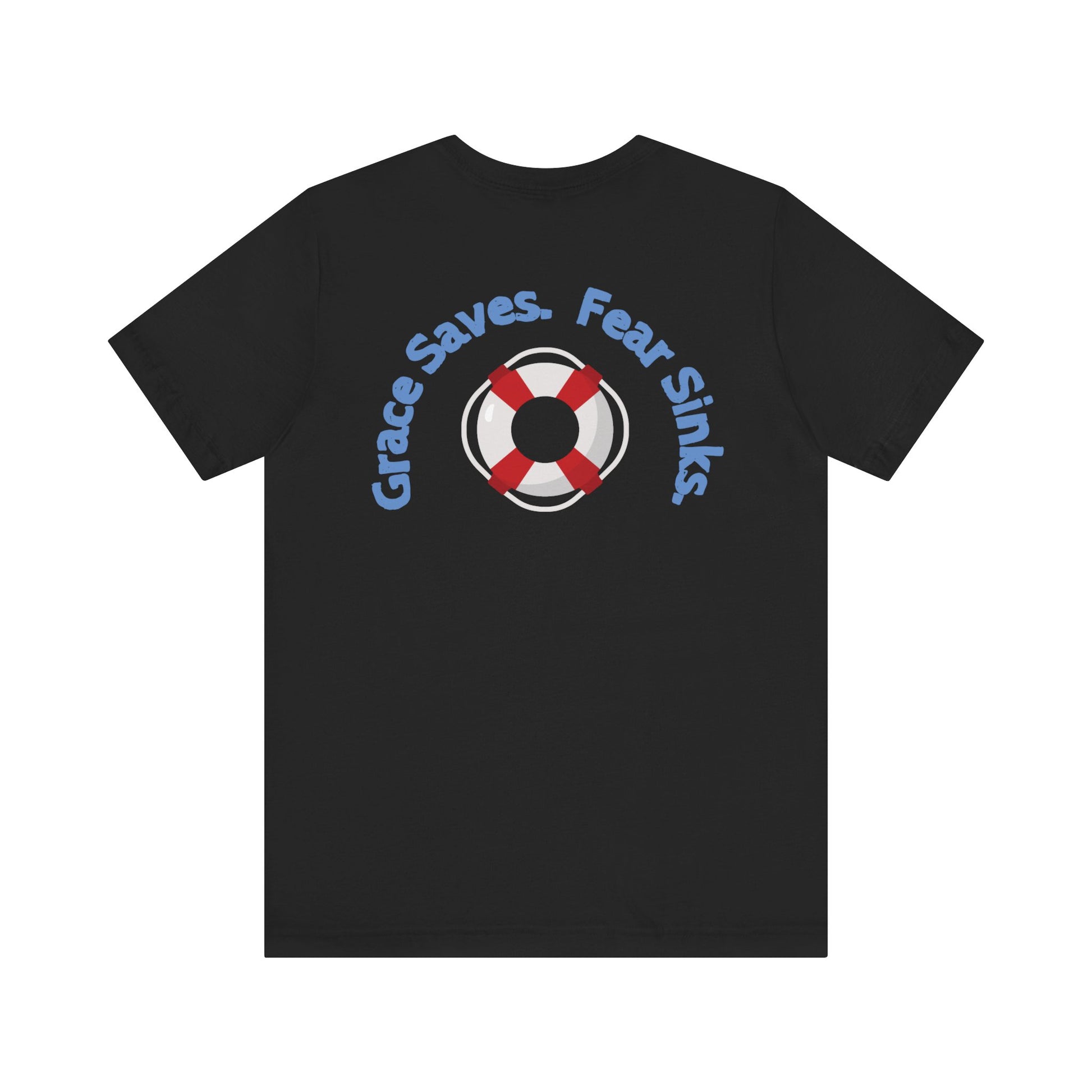 Walk by faith, not by fear with our Grace Saves, Fear Sinks T-shirt. Inspired by Jesus walking on water, this design is a bold reminder that grace keeps us afloat while fear pulls us under. Made with premium fabric for all-day comfort, this tee is perfect for anyone ready to step out in faith and make a statement. Wear it, live it, believe it.