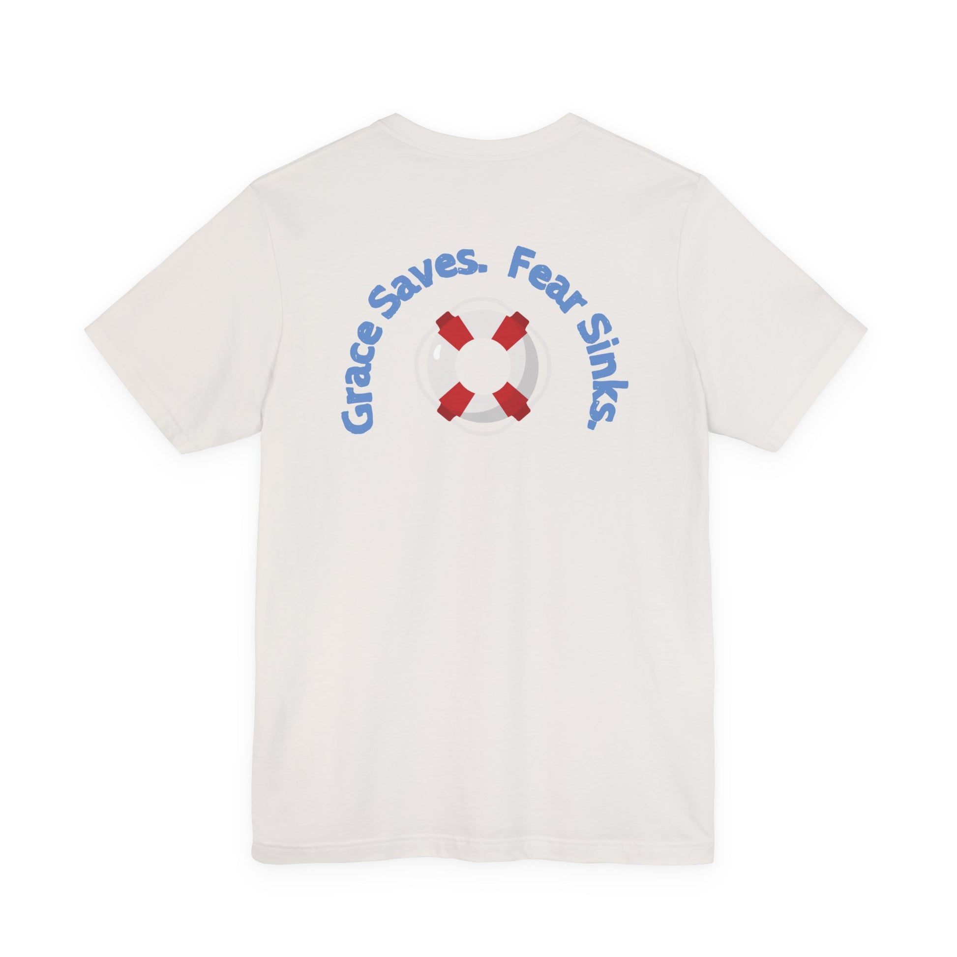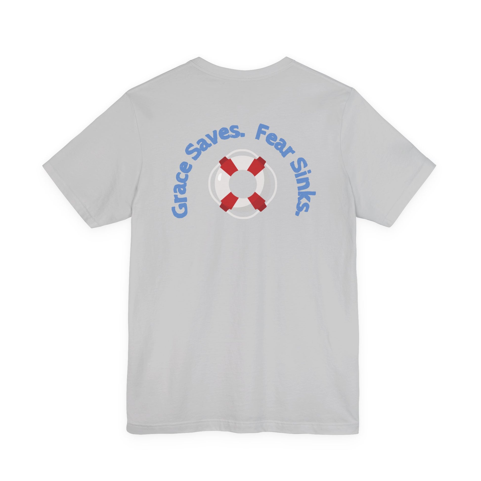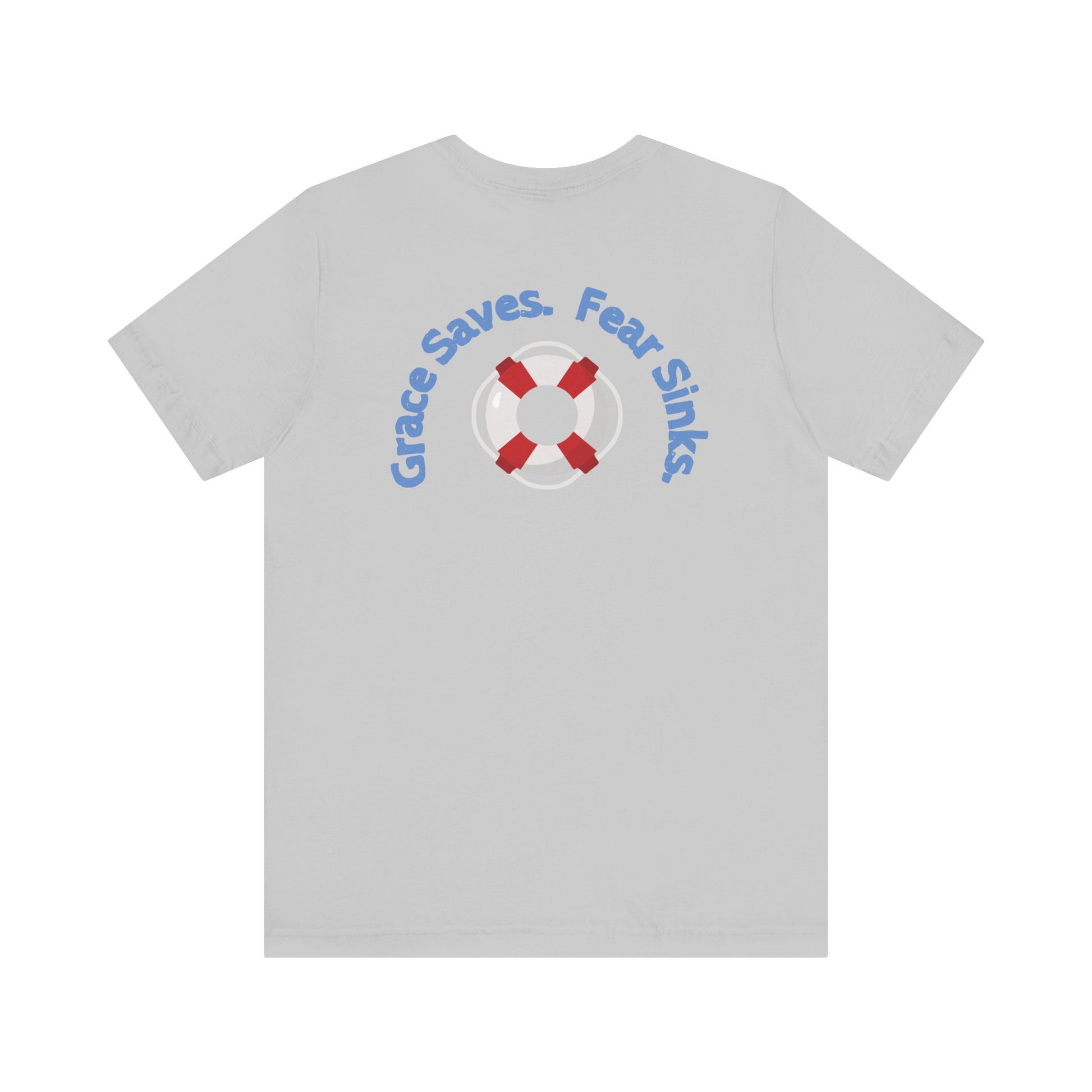 Walk by faith, not by fear with our Grace Saves, Fear Sinks T-shirt. Inspired by Jesus walking on water, this design is a bold reminder that grace keeps us afloat while fear pulls us under. Made with premium fabric for all-day comfort, this tee is perfect for anyone ready to step out in faith and make a statement. Wear it, live it, believe it.